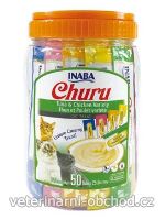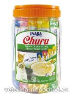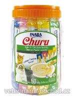 Churu Cat Vet Diet Purée Tuna&Chicken Varieties 50x14g Veterinární receptura Churu Vet Diet masové pyré pro kočky s divokým mořským tuňákem nebo kuřecím z farmového chovu a přídavkem taurinu a extra nízkým obsahem kalorií.